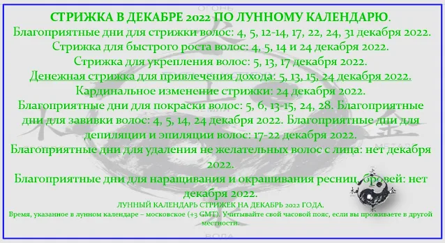 ЛУННЫЙ КАЛЕНДАРЬ СТРИЖЕК НА ДЕКАБРЬ 2022 ГОДА. - Время, указанное в лунном календаре – московское (+3 GMT). Учитывайте свой часовой пояс, если вы проживаете в другой местности.