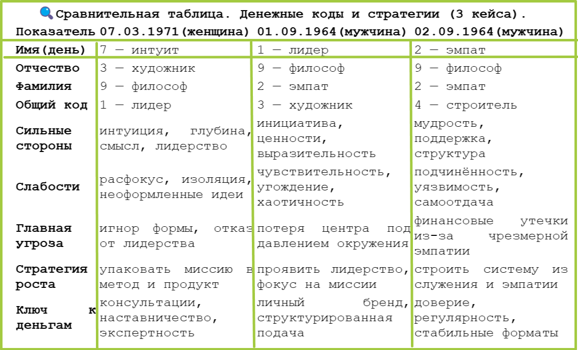 VIII. Индивидуальный разбор: 01.09.1964. Интерпретация, 1 — лидерская энергия: деньгам нужен путь через инициативу и влияние. 9 — ориентация на смысл и миссию. 2 — чувствительность, зависимость от окружения. 3 — всё реализуется через форму, подачу, творчество. Угроза, много мягких кодов (2 и 3) снижают устойчивость. Важно чётко заявлять позицию (1) и не теряться в угождении другим.